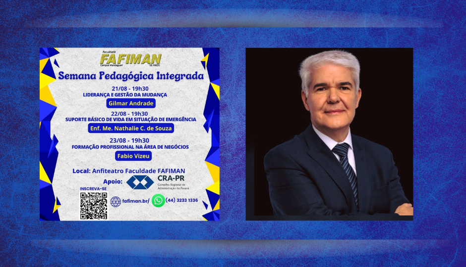 No dia 21 de agosto, às 19h30, acontecerá a palestra Liderança e Gestão de Mudança, com o Adm. Gilmar Andrade, conselheiro e diretor de Eventos do Conselho Regional de Administração do Paraná (CRA-PR), na Fundação Faculdade de Filosofia, Ciências e Letras de Mandaguari (FAFIMAN), Campus Mandaguari.