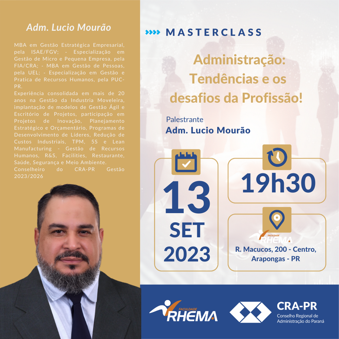 No dia 13 de setembro na Faculdade RHEMA de Arapongas-PR, vai receber o Administrador e Conselheiro do CRA-PR, Lucio Mourão, para Masterclass sobre o tema: Administração: Tendências e desafio da Profissão.