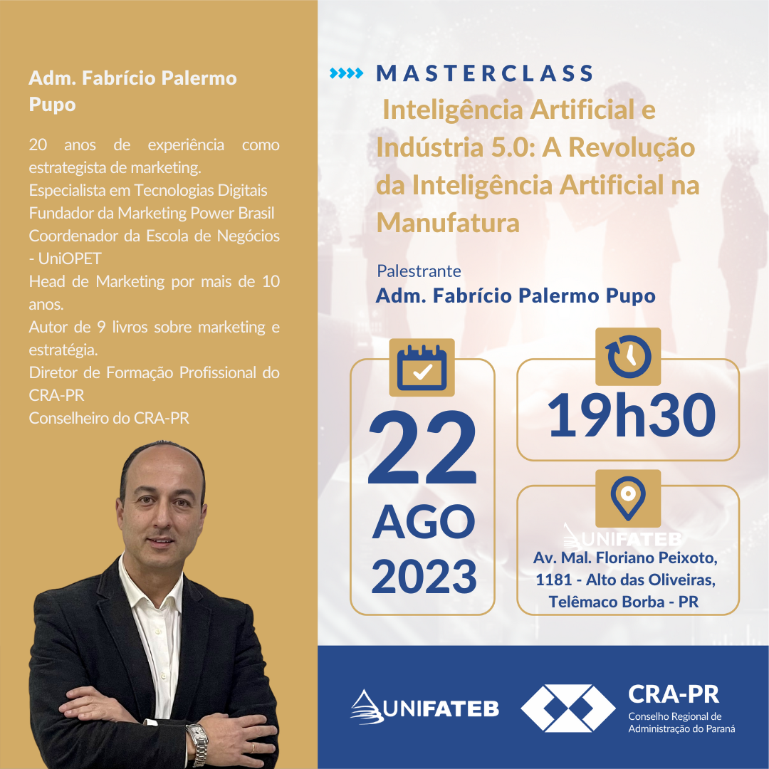 No dia 22 de agosto na UNIFATEB semana de Administração, na cidade de Telêmaco Borba-PR ira receber o Adm. Adm. Fabrício Palermo Pupo, para Masterclass sobre o tema: Inteligência Artificial e Indústria 5.0: A Revolução da Inteligência Artificial na Manufatura