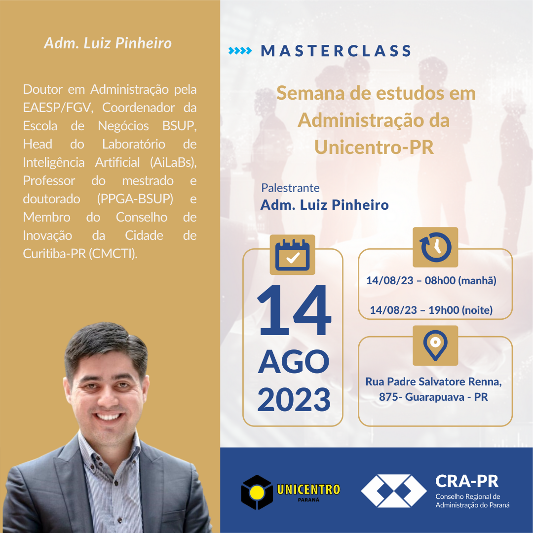 No dia 14 de agosto na Unicentro, na cidade de Guarapuava-PR vai receber o Administrador e Professor Luiz Pinheiro, para palestra na semana de estudos em Administração.
