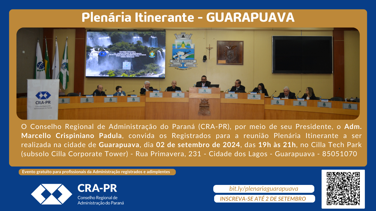 O Conselho Regional de Administração do Paraná (CRA-PR), por meio de seu Presidente, o Adm. Marcello Crispiniano Padula, convida todos os seus Registrados e sociedade em geral para a reunião Plenária Itinerante a ser realizada na cidade de Guarapuava, dia 02 de setembro de 2024, das 19h às 21h, no Cilla Tech Park (subsolo Cilla Corporate Tower) – Rua Primavera, 231 – Cidade dos Lagos – Guarapuava – 85051070.
